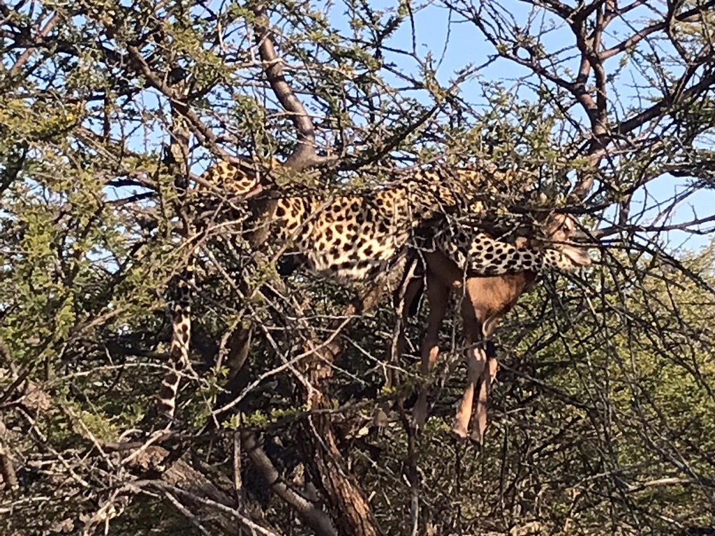 Die Rückreise nach Windhoek war für den frühen Morgen geplant, da wir noch zum PCR Test antreten mussten. Wir fahren über Okonjima, wo wir noch zwei wunderschöne Zimmer sowie das Rescue Center «AfriCat» besichtigen und einmal mehr kulinarisch verwöhnt wurden. Ein Ort, der zum Bleiben einlädt, was mein Zimmergspänli dann auch glatt in die Tat umsetzte. Wir beneideten sie alle sehr, vor allem, da sie auf der Pirschfahrt am Abend eine Leopardin mit frischer Beute begegnete. WOW!