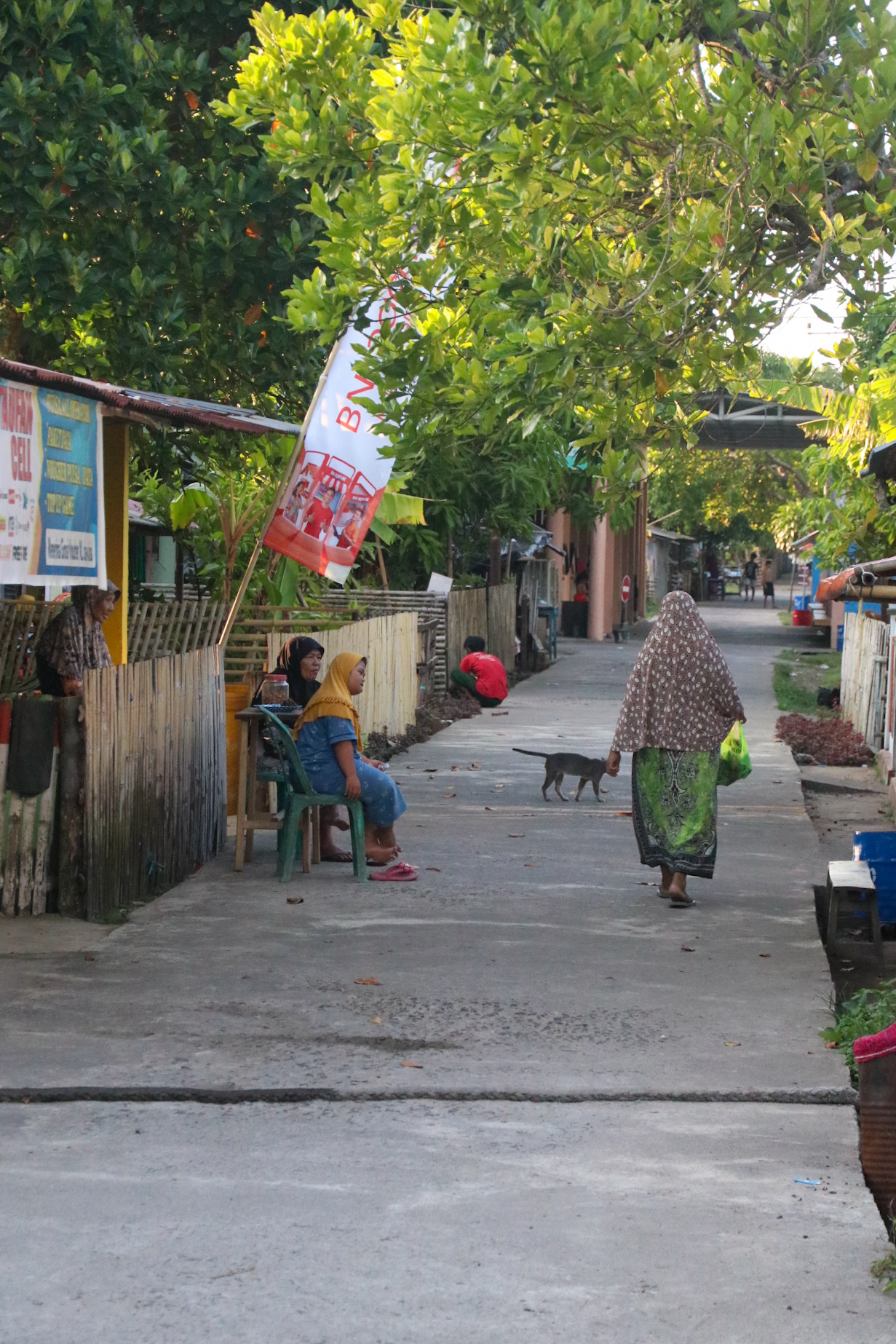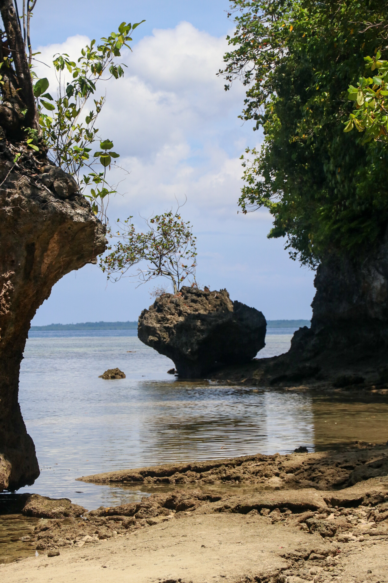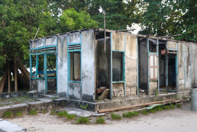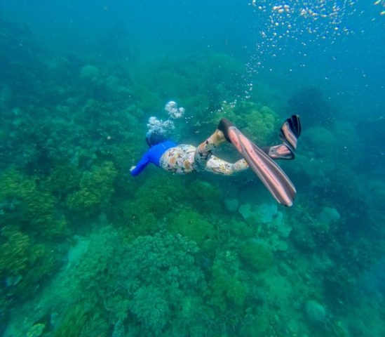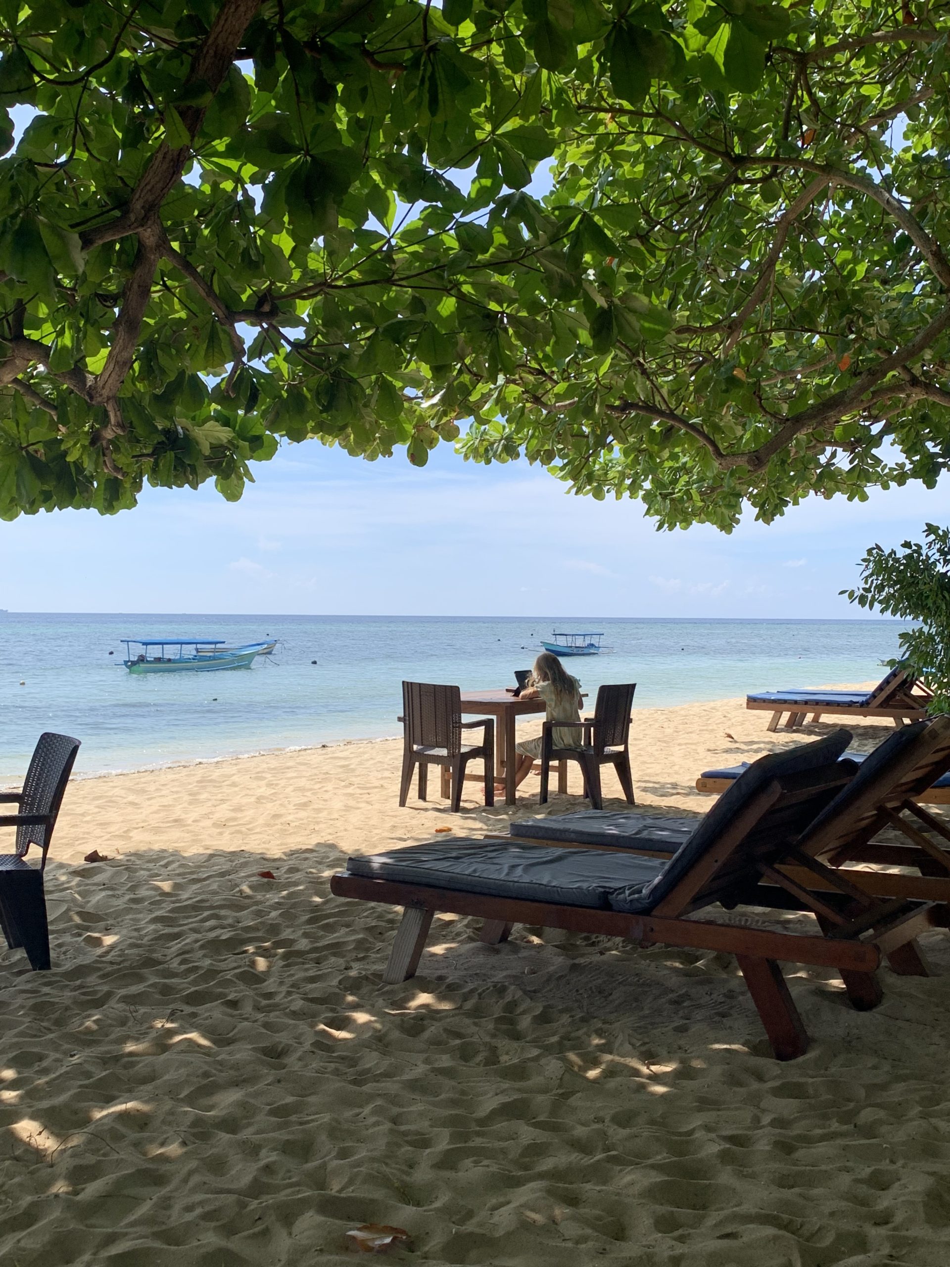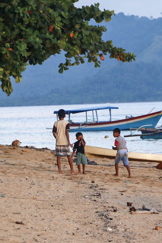 Unser nächstes Reiseziel ist die kleine Nachbarinsel Siladen. Hier verbringen wir 4 Nächte im Bobocha Siladen, direkt am Strand. Das Resort trumpft mit einem Pool, einer Massageliege und einem umwerfenden Essbereich am Strand auf. Ausserhalb des Resorts ist die Insel leider relativ schlecht gepflegt, bei einem kurzen Spaziergang gehen wir an mehr Ruinen vorbei als Häusern. Der Zustand auf der Insel tut der Freundlichkeit ihrer Bewohner allerdings keinen Abbruch. Der Hotelmanager setzt sich beim Abendessen an die lange Tafel und interessiert sich für seine Gäste, was einen tollen ersten Eindruck hinterlässt. Wir lernen zwei nette Deutsche Frauen kennen mit denen wir uns super verstehen. So können Raphi und ich auch ohne Probleme eine Nacht-Schnorchel-Tour machen und die Kinder in deren Obhut lassen. Das Nachtschnorcheln ist eine fantastische Erfahrung, die Unterwasserwelt ist im Dunkeln eine komplett andere und unser Guide findet gekonnt verschiedene Tiere: Feuerfische, Steinfische, Skoprionfische, Wasserschlangen, Muränen, riesige Schwammkrabben und sogar einen Oktopus. Bei absoluter Low-Tide kann man rund um die Insel herum laufen, was zu einigen sehr schönen Fotospots führt. Im seichten Wasser kann man sogar kleine Muränen sehen, Badeschuhe oder ähnliches sind aber empfohlen, da einige Felsen und Steine sehr rutschig sein können. Während unserem Aufenthalt stellen wir hier und da ein paar «Mängel» fest und philosophieren während einer schönen Cocktailrunde mit den Deutschen darüber, wie wir die Insel innert kürzester Zeit auf Vordermann bringen würden. Es handelt sich dabei natürlich um Kleinigkeiten (zum Beispiel geht der Rum und der Gin nach 4 Cocktails bereits aus), denn im Grossen und Ganzen sind wir sehr zufrieden.