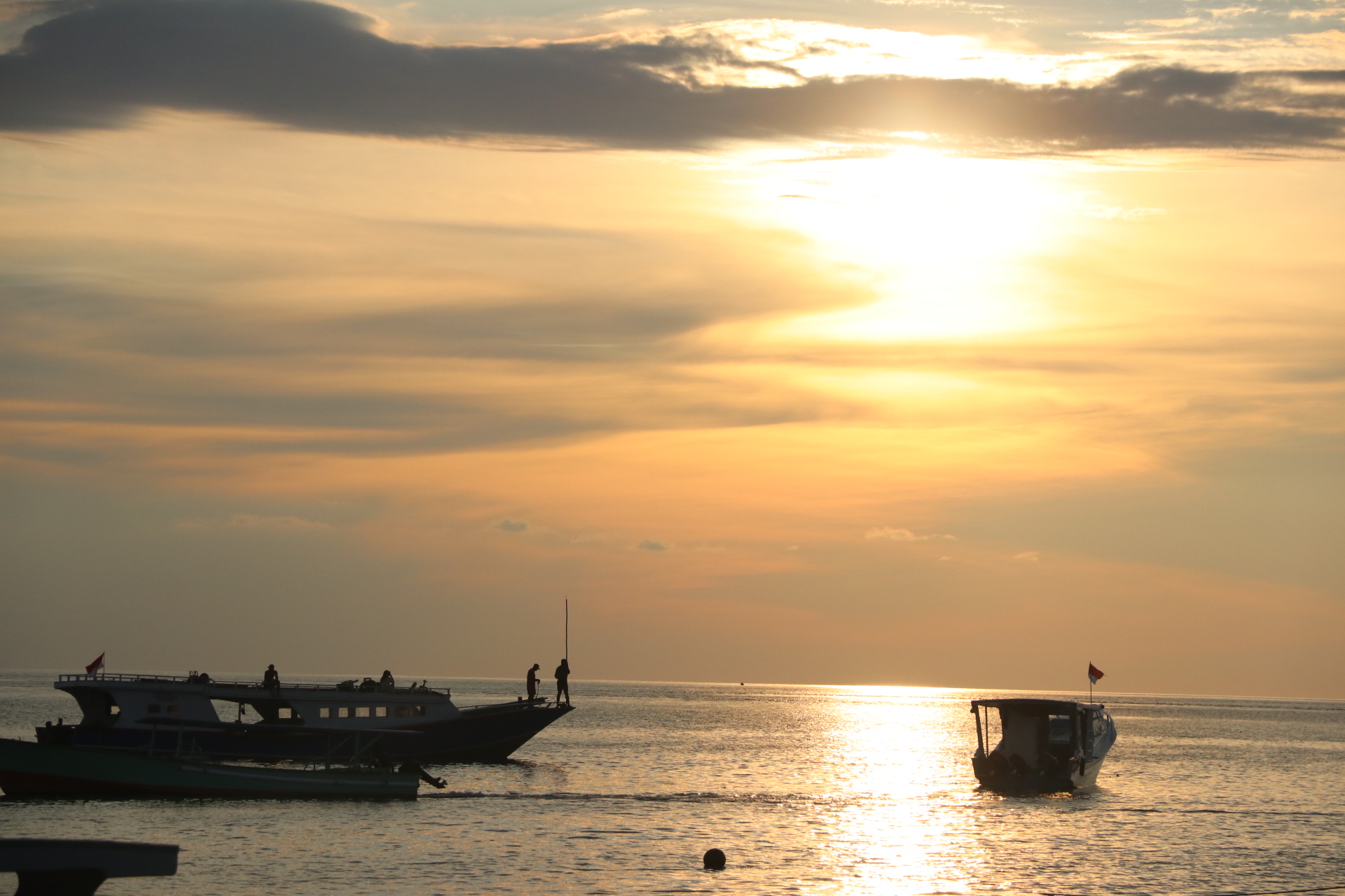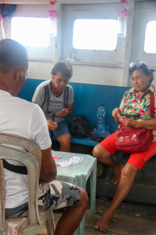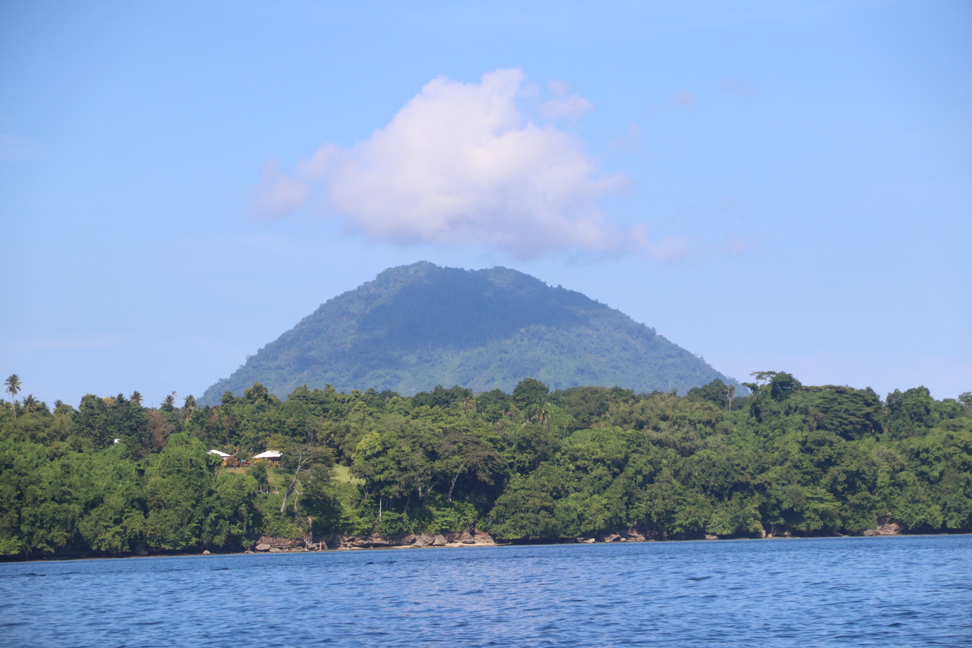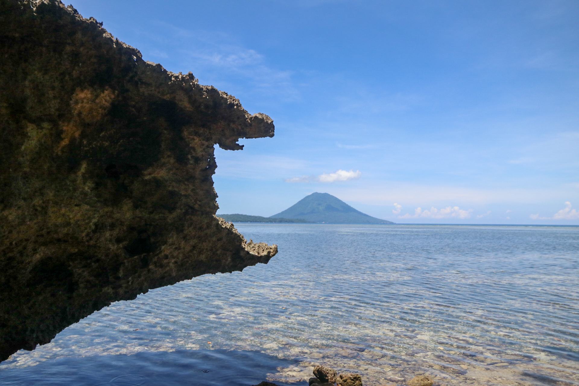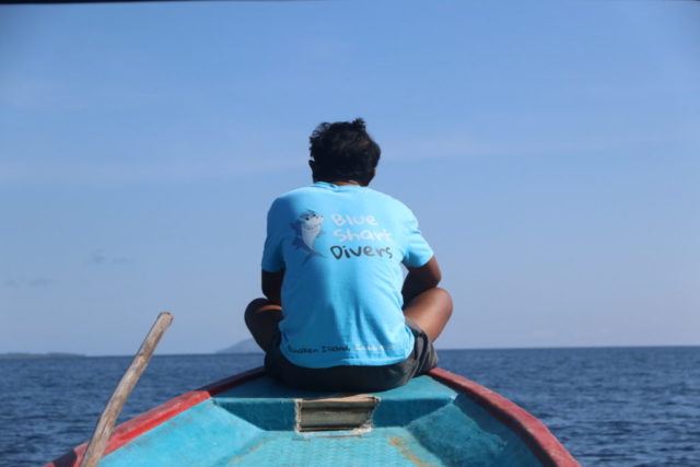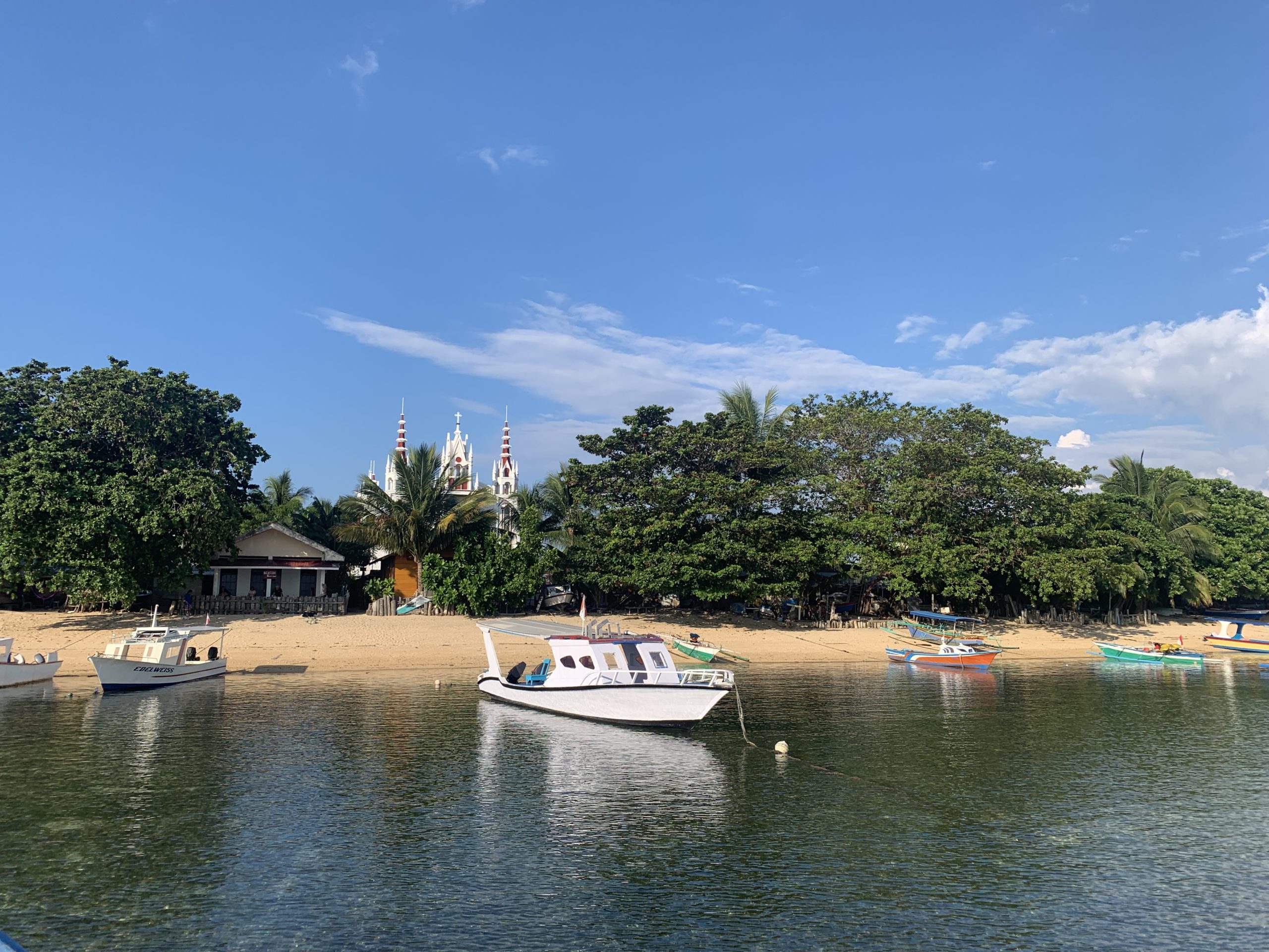 Bestens ausgestattet geht’s nach 2 Nächten zum Hafen, wo wir mit der öffentlichen Fähre nach Bunaken Fahren. Da uns Dion, der Chef des Blue Shark Divers beim Fähr-Kapitän angemeldet hat sind wir in null Komma nichts an Bord. Die Fähre wird mit allerlei Waren (Reis, Wasser, Bier, Süssgetränke, einem Kühlschrank, etc.) beladen und legt mehr oder weniger pünktlich etwas nach 14.00 Uhr ab. Die Ankunft auf Bunaken ist sehr schön, das Wasser ruhig und klar, weshalb wir schon beim Anlegen viele Seesterne und bunte Fische sehen. Die Auswahl an Unterkünften auf Bunaken ist gross und reicht von einfachen Homestays über Hostels bis hin zu kleinen aber feinen Resorts und Hotels. Wir kommen Budgetfördernd im Homestay unter und sind damit absolut zufrieden. Die beiden Zimmer sind mit einem bequemen Bett und einem eigenen Bad ausgestattet, zudem werden wir dreimal täglich lecker indonesisch bekocht. Den Eintritt in den Nationalpark Bunaken, der mit einem Besuch der gleichnamigen Insel oder einer der umliegenden Inseln fällig wird, kann man einem eTicket begleichen. Wir machen eine Delfintour, auf der wir jedoch leider keine Delfine sehen, dafür aber ganz überraschend einen Pottwal. Der graue Riese schwimmt einige Zeit neben unserem Boot bevor er abtaucht, ein absolutes Highlight. Auf diversen Schnorchelausflügen rund um die Insel sehen wir viele Schildkröten, Trompetenfische, Papageienfische, eine Muräne und vieles mehr. Die Unterwasserwelt ist sehr bunt und wunderschön. Heftige Niederschläge über Manado führen leider dazu, dass viel Müll aus der Stadt angeschwemmt wird. Den besten Kaffee auf der Insel gibt’s im Cocoblue Café, wo wir uns nebst Kaffee auch gerne eine Kugel Vanille-Eis gönnen.